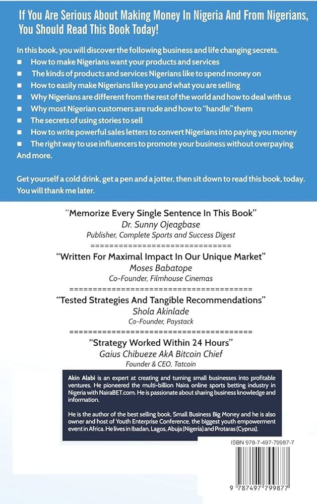 How to Sell to Nigerians by Akin Alabi is a practical business and marketing guide that explains the psychology of Nigerian consumers and how entrepreneurs can effectively reach them. Drawing from real-life case studies and his own experience as a successful businessman, Alabi reveals cultural nuances, buying habits, and persuasive strategies that help businesses thrive in Nigeria’s unique market.