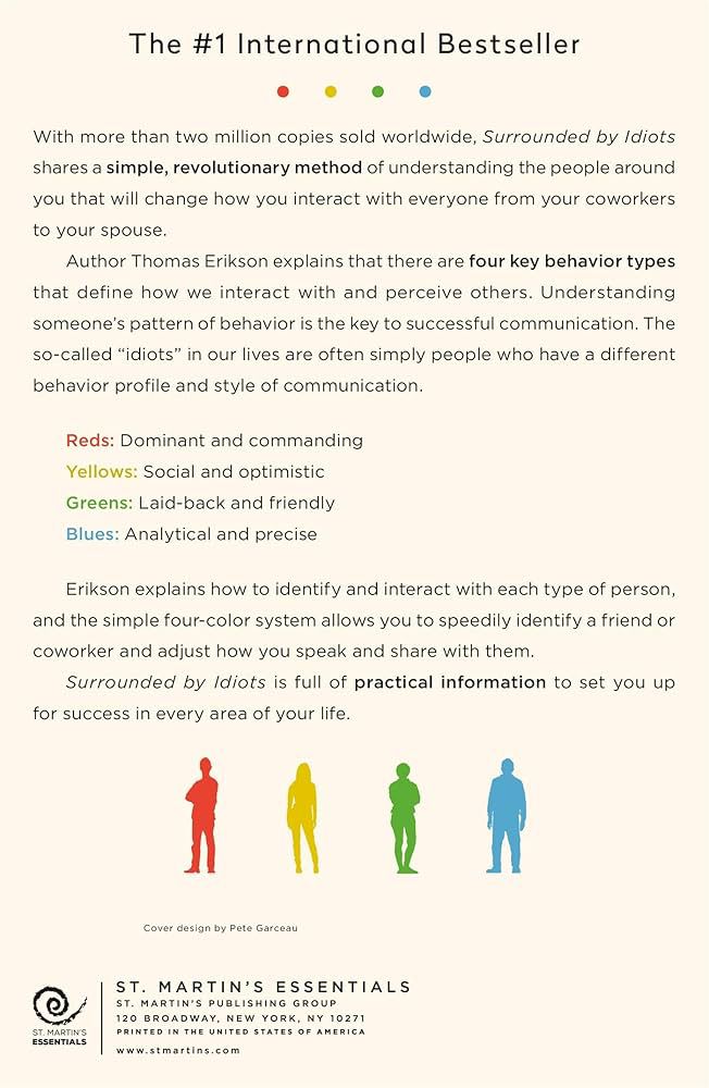 Erikson introduces a model that categorizes human behavior into four personality types—Red, Yellow, Green, and Blue—based on the DISC system. Each color represents a distinct communication style and way of processing information. By learning to recognize these types, readers can improve relationships, reduce misunderstandings, and navigate conflicts more effectively