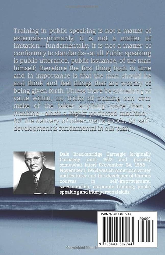 The Art of Public Speaking teaches readers how to overcome stage fright, organize ideas, and deliver speeches with clarity and conviction. Carnegie emphasizes sincerity, practice, and emotional connection as the foundation of effective communication. The book is filled with exercises, examples, and strategies to help anyone—from students to professionals—become a confident speaker
